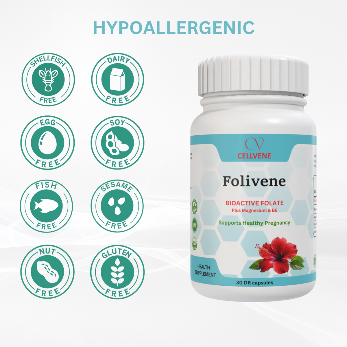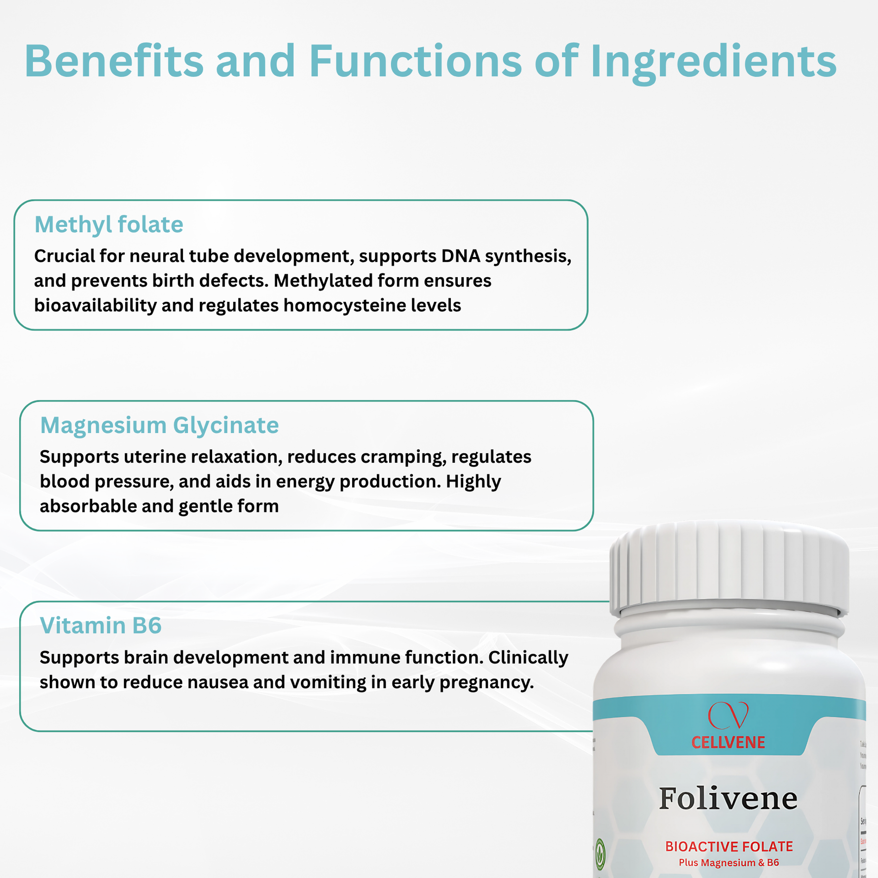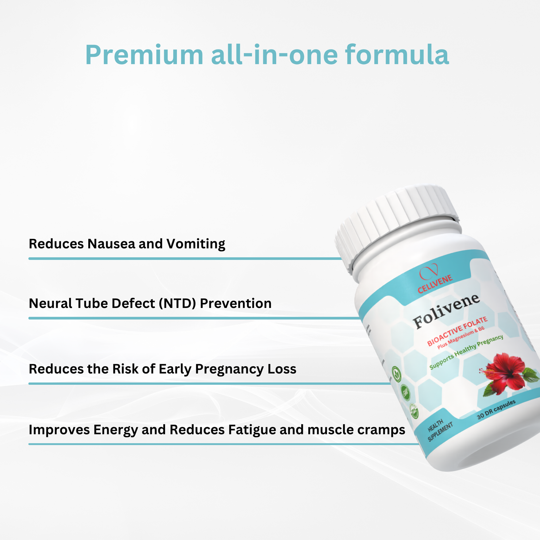 Folivene is a health supplement designed to support women before and during pregnancy by promoting healthy fetal development, maternal hormonal balance, and optimal nutrient absorption. It contributes to proper neural tube formation, aids in the regulation of homocysteine levels, and supports the development of the baby’s brain and nervous system. Additionally, it helps reduce fatigue, supports mood stability, and plays a role in muscle function and energy metabolism. Notably, it includes support for managing nausea and vomiting in the first trimester, as vitamin B6 has been clinically shown to reduce the frequency and severity of morning sickness. Overall, this formula helps create a supportive physiological environment for a healthy pregnancy and fetal growth.